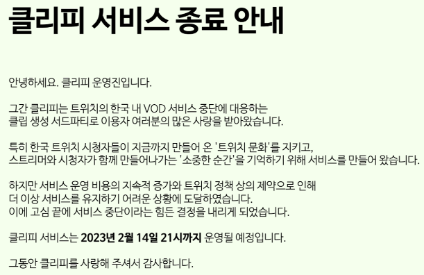 작년 12월 트위치의 VOD 시청 금지 조치 이후 출범한 클리피도 서비스를 종료하는 모양이다.