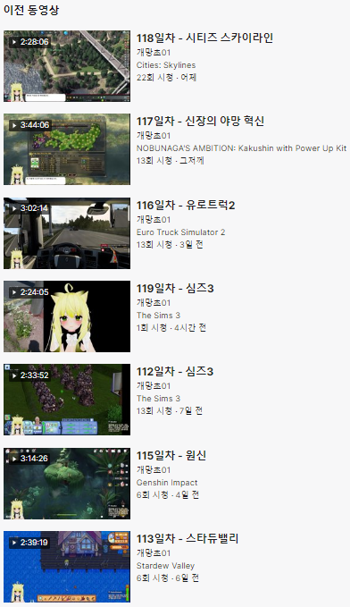 심즈3 방송을 마치고 다시보기 리스트를 캡처해보았다. 이 방송이 다시보기가 기록되는 마지막 방송일 것이다.