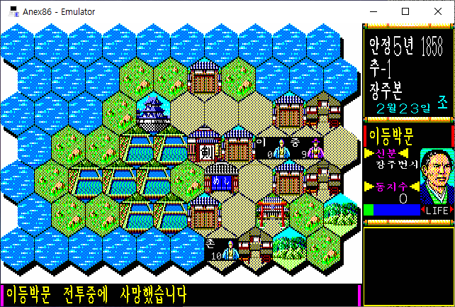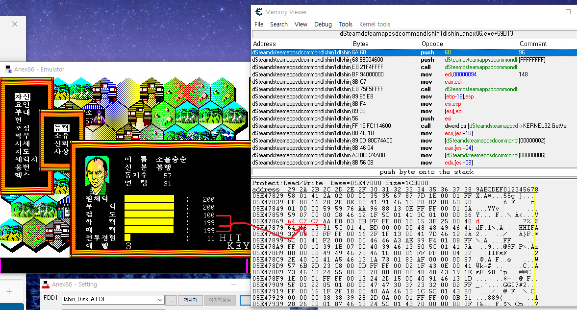 메모리 에디터에선 동지수(2바이트) + 무력 (1바이트) + 현재체력 (1바이트) + 원래체력 (1바이트) 순으로 바이트 나열이 되어 있으니, 동지수와 무력의 수치를 검색한 뒤 메모리 값을 변경하는 게 편할 것이다.