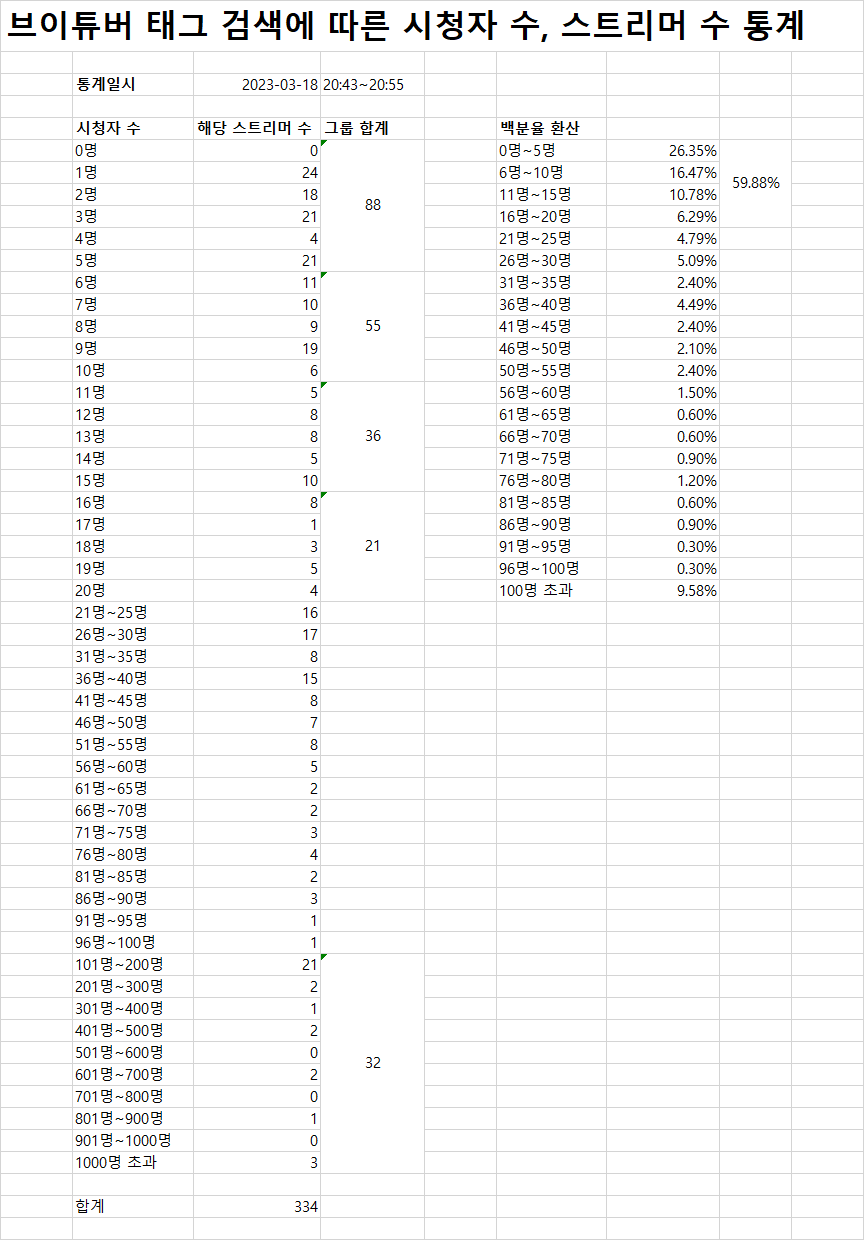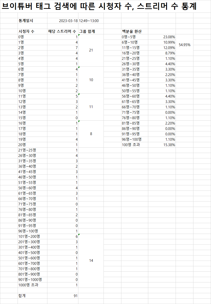 그래서 3월 18일(토요일) 점심시간대와 저녁 시간대에 트위치 검색창에 '브이튜버' 라고 검색을 한 뒤, 통계를 내보았다.