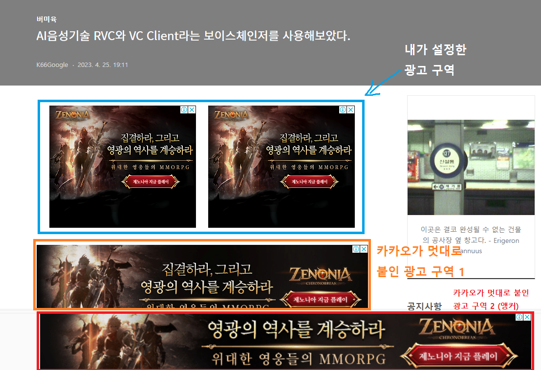광고판을 달때 난 본문 상단에 광고가 좌우로 2개씩 나오도록 이쁘게 배치해뒀다. 광고 사이즈도 미관상 작게 나오는 편이 좋다고 생각해서 그렇게 설정해두었다. 그런데 그 밑으로 카카오가 멋대로 큼지막한 광고판을 달고 자빠진 것이다.