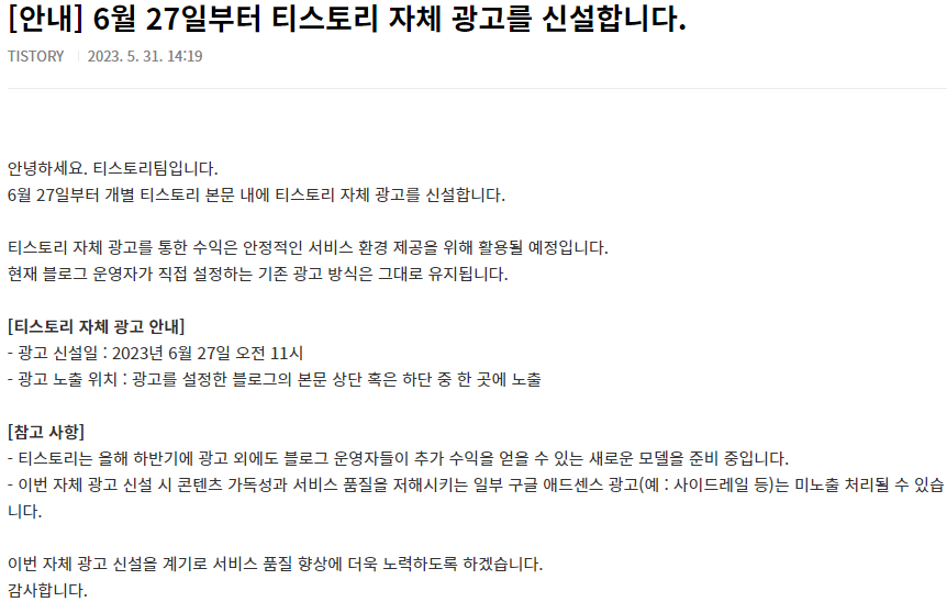 티스토리를 운영하는 카카오가 돈이 궁했는지 '자체 광고' 라는 명목으로 애드센스 광고판을 달아놓은 티스토리 블로그에 자기들 애드센스 계정의 광고판을 달기 시작한 것이다. (자사 광고 플랫폼인 애드핏이 있는데도 불구하고 말이다.)