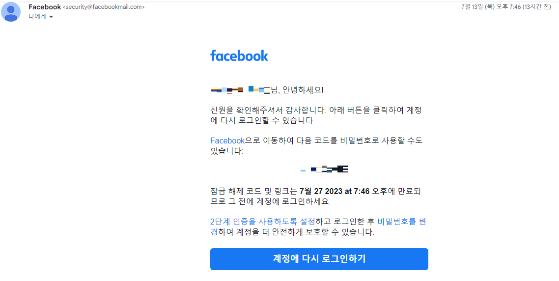 몇 시간 후, 다행히도 통과가 되었는지 계정에 다시 로그인할 수 있다는 메일이 왔다.