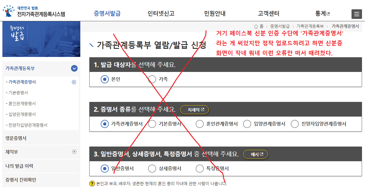 거기 페이스북 신분 인증 수단으로 '가족관계증명서' 라는 게 있길래, 가족관계증명서를 발급받아 업로드를 시도해보기로 하였다. 그러나 '신분증 화면이 작네 뭐네~' 이런 오류만 뜨면서 업로드가 되지 않았다.