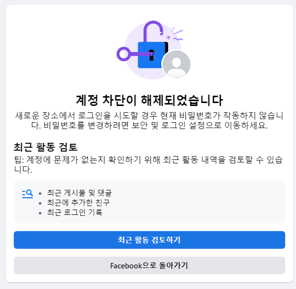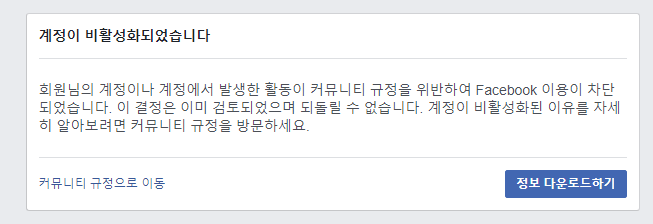 그렇게 하니까 무슨 커뮤니티 규정을 위반해서 페이스북 이용이 차단되었다는 개소리만 출력되고 계정은 풀리지 않았다.