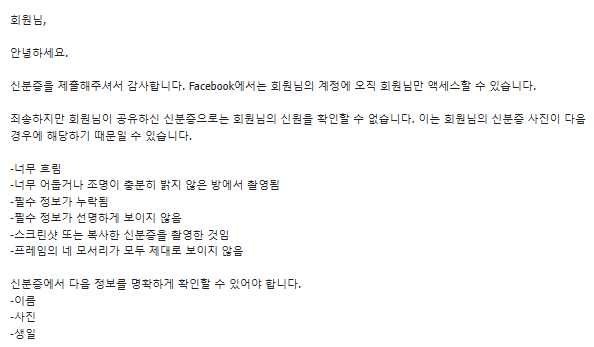 아무튼, 이번 계정은 PC에서 로그인한 적이 단 한 번도 없다. 오로지 스마트폰에서만 로그인을 했으니, 스마트폰에서 신분 인증을 거치기로 한다. 주민등록증을 찍어서 페이스북 놈들에게 보냈다. 그런데... 신원을 확인할 수 없댄다.