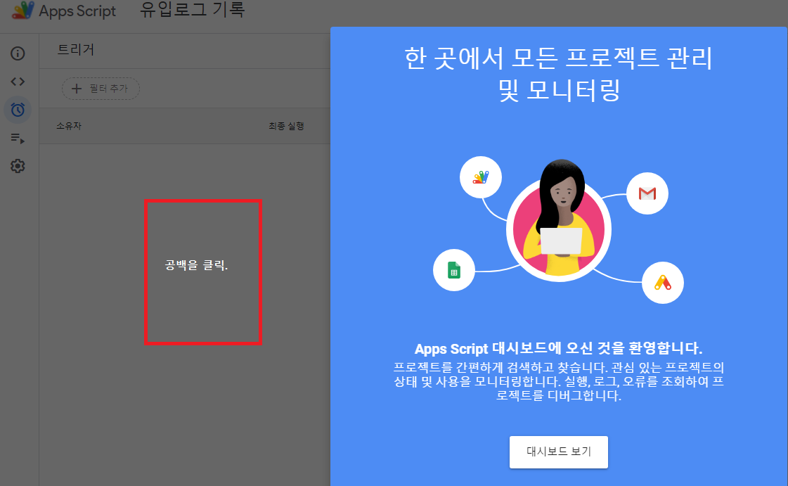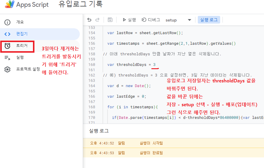 이제 시간마다 로그 기록을 판별해서 지울지 말지 결정하게 해주는 트리거를 작동시켜야 한다. 왼쪽 메뉴에서 '트리거' 를 클릭한다.