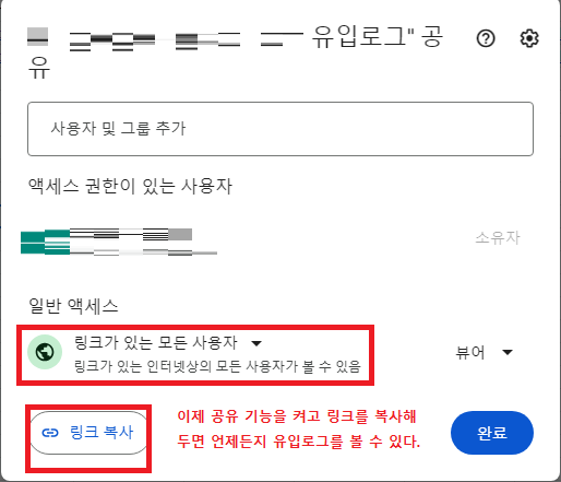 마지막으로 화면 우측 상단의 '공유' 버튼을 눌러서 '링크가 있는 모든 사용자' 로 모드를 바꾼 다음, '링크 복사' 를 누른다.