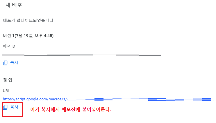 그 후 '웹 앱'의 URL을 복사해서 메모장에 붙여넣어둔다.
