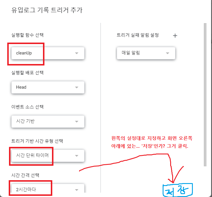 실행할 함수는 'cleanUp' , 트리거 기반 시간 유형은 '시간 단위 타이머', 시간 간격은 '2시간마다' 로 하고 오른쪽 아래의 '저장' 버튼을 누른다.