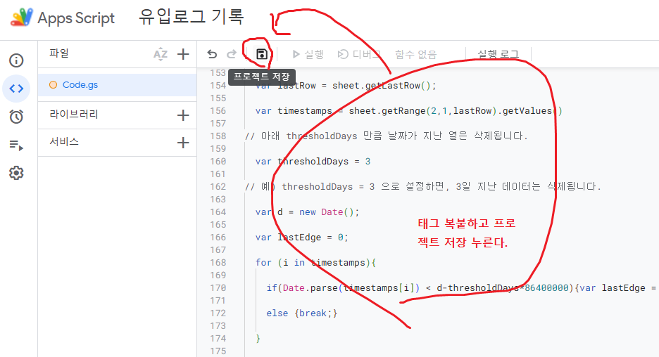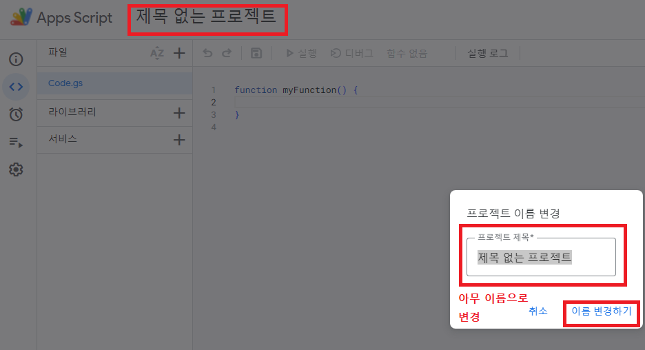 Apps Script 페이지가 열리면 이것도 이름부터 변경한다.