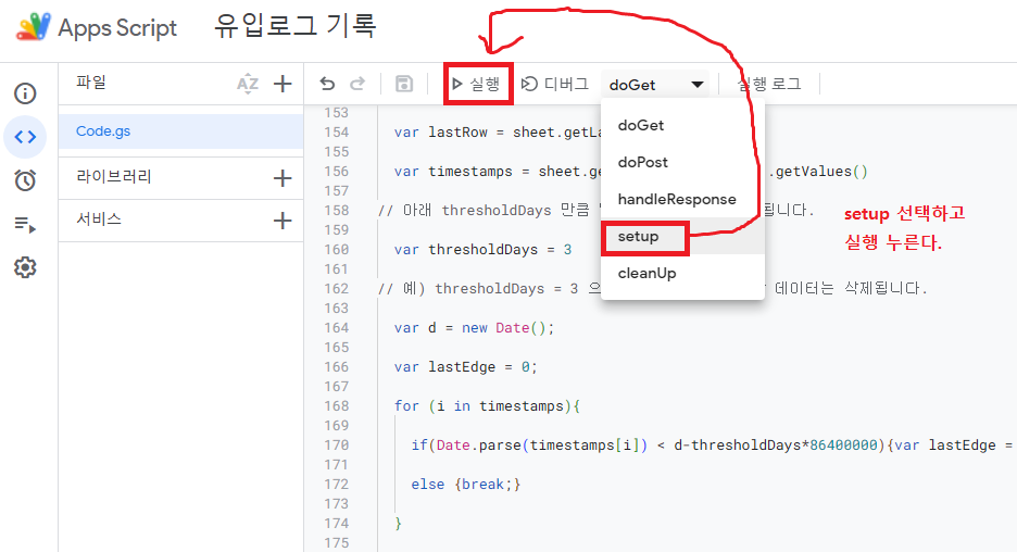 저장됐으면 함수 목록에서 'setup' 을 선택하고 '실행' 버튼 누른다.