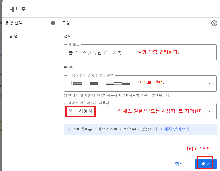 '새 설명' 에는 대충 입력하고, '다음 사용자 인증 정보로 실행' 에는 '나' 를 선택하고, '액세스 권한이 있는 사용자' 는 '모든 사용자' 로 지정한다. 그리고 '배포' 누른다.