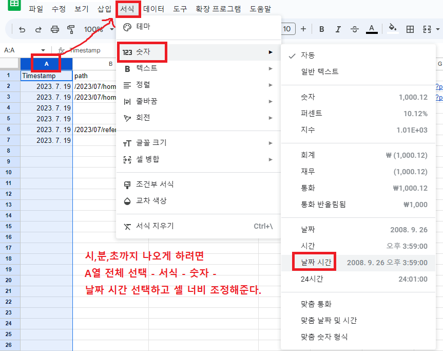 이제 Timestamp가 있는 A열 전체를 선택하고, '서식 - 숫자 - 날짜 시간' 을 선택해준다.
