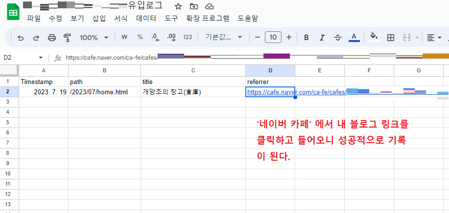 다시 유입로그 스프레드시트로 돌아온 뒤, 1행에 'Timestamp', 'path', 'title', 'referrer' 라고 적는다.