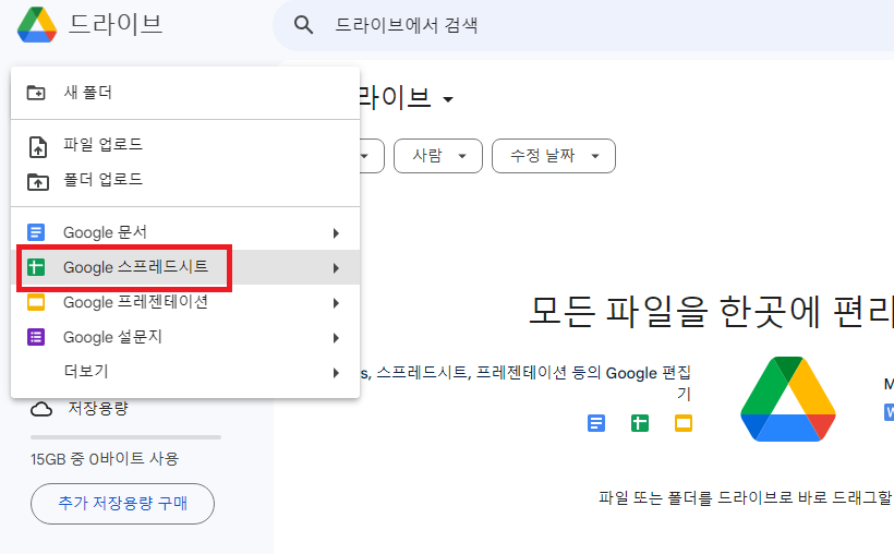 구글 드라이브에 들어가서 'Google 스프레드시트' 를 클릭한다.