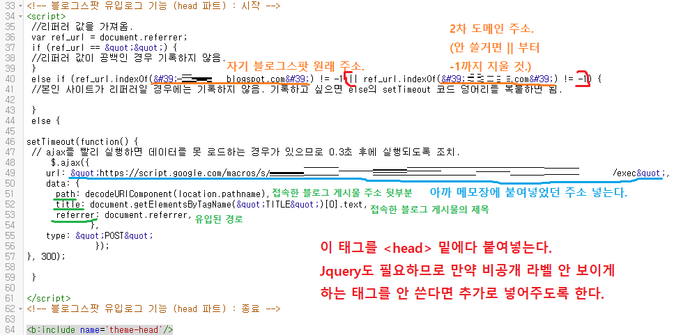 이런 식으로, 구글 블로그스팟에 티스토리 같은 유입로그 기능을 추가해보았다.