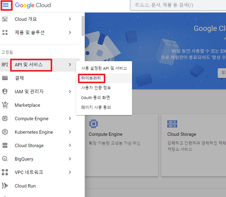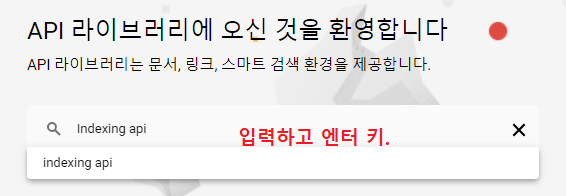 이제 화면 왼쪽 상단의 三 - 'API 및 서비스' - '라이브러리' 에 들어간 뒤, 검색창에 'Indexing api' 라고 입력하고 엔터 키 친다.