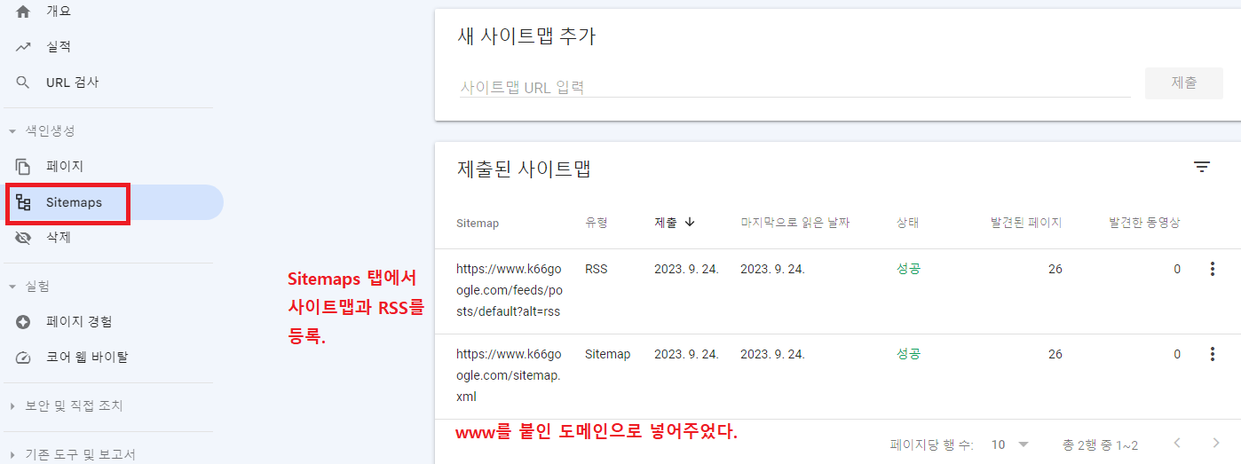 그리고 Sitemaps 탭에서 사이트맵과 RSS를 등록해준다.