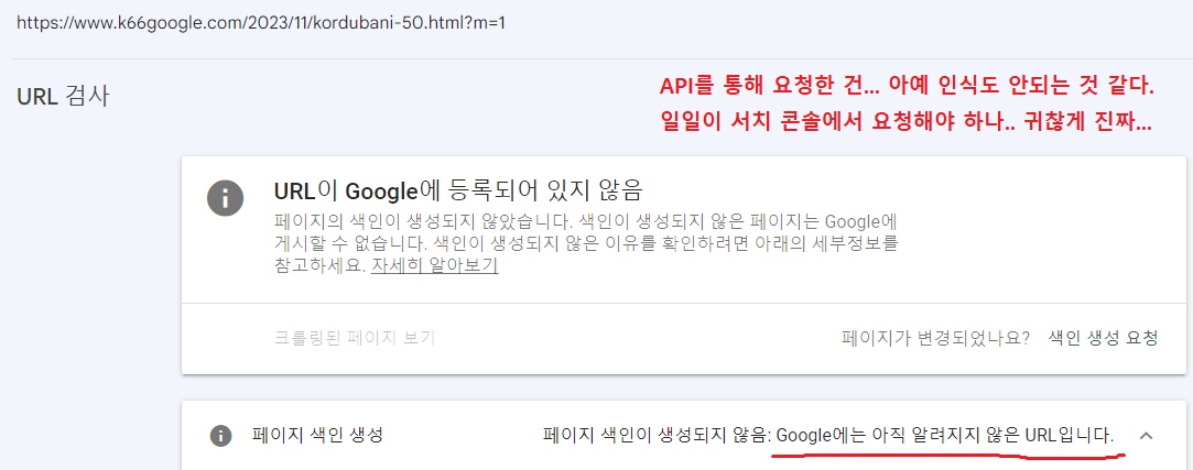 API를 통해 아무리 URL을 제출해도 '발견됨 - 현재 색인이 생성되지 않음', 'Google에는 아직 알려지지 않은 URL입니다.' 같은 소리만 뜨는 걸 보면서, 나는 API 색인 요청 스크립트가 사실상 무용지물이나 다름없는 것 아닌가라는 생각이 들었다.