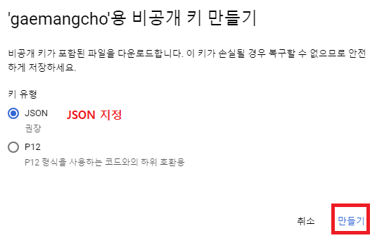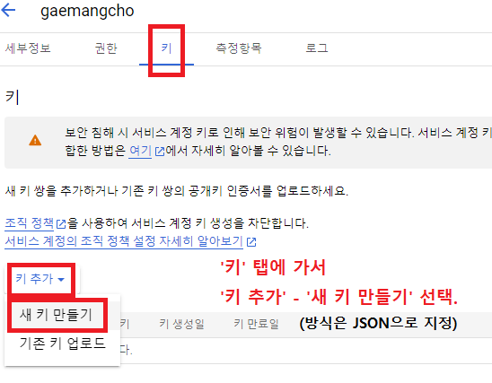그리고 '키' 탭으로 가서 '키 추가' - '새 키 만들기' 를 선택한다. 유형은 JSON으로 지정하고 '만들기' 버튼을 클릭하면...