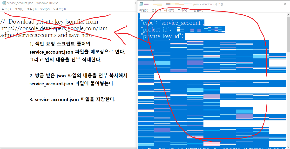 1. 또 하나의 메모장을 더 켜고 색인 요청 스크립트 폴더의 'service_account.json' 파일을 불러온 뒤, 안의 내용을 전부 삭제한다.