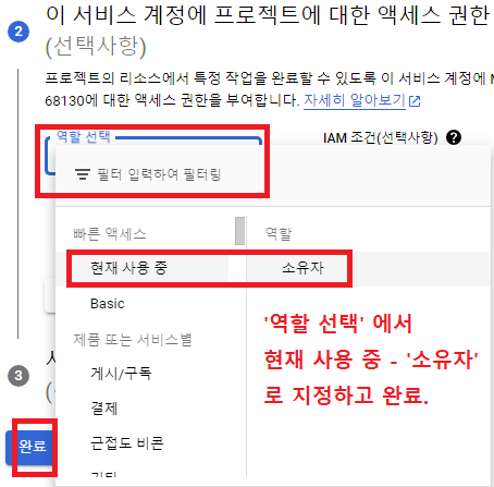 그리고 '역할 선택' 은 '현재 사용 중' - '소유자' 로 지정해주고 '완료' 눌러준다.