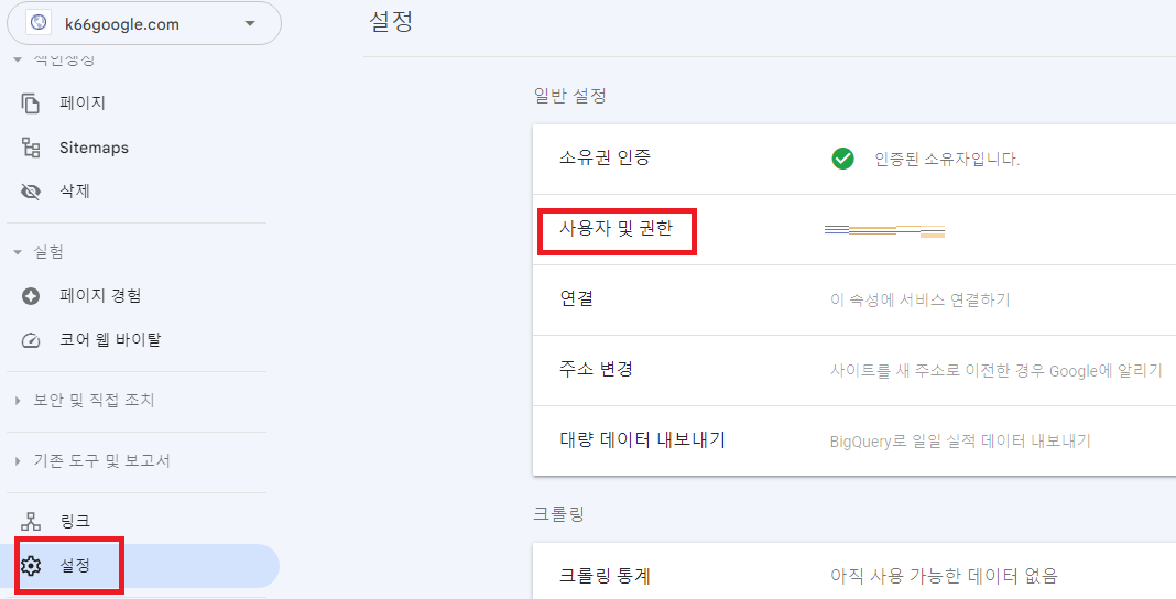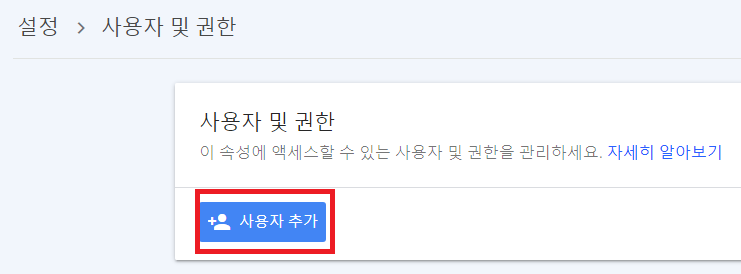 완료했으면 다시 서치 콘솔로 돌아가서 '설정' - '사용자 및 권한' - '사용자 추가' 로 들어간다.