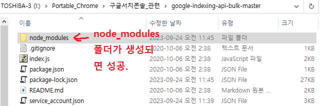 그러면 스크립트 폴더 안에 node_modules 폴더가 생성된다. 이렇게 하면 스크립트를 실행하기 위한 초기 설정이 완료된 것이다.