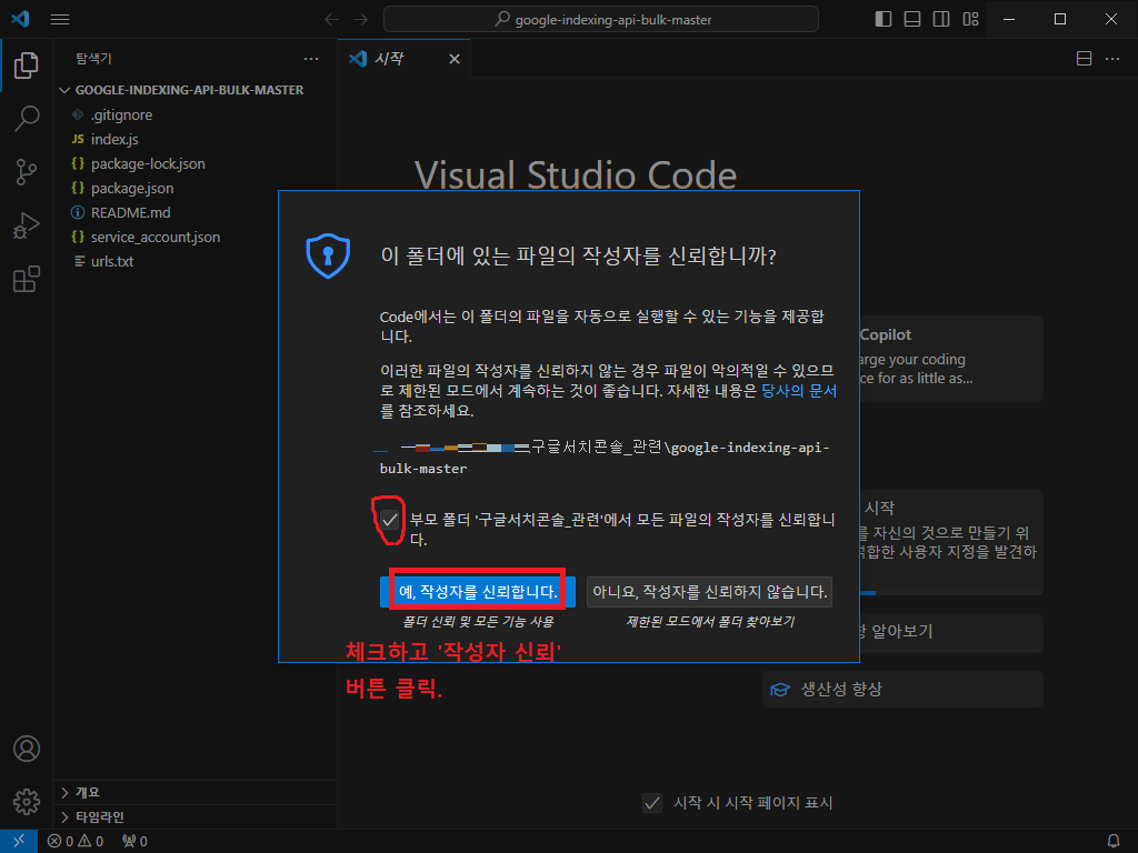 체크박스에 체크하고, '작성자를 신뢰합니다' 를 클릭하였다.