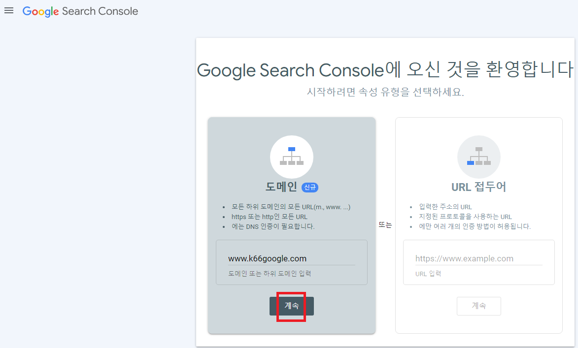 다음으로는 구글 서치콘솔(링크)에 가서 내 블로그스팟을 등록하기로 한다. 도메인 주소를 입력하고 '계속' 을 클릭한다.