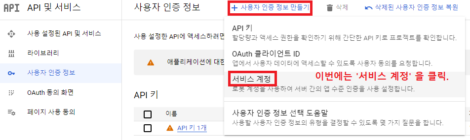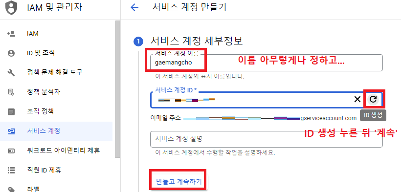 같은 식으로 이번에는 '서비스 계정' 을 클릭한다. 서비스 계정 이름은 그냥 아무렇게나 정하고, 'ID 생성' 버튼을 누른 뒤 '만들고 계속하기' 를 클릭한다.