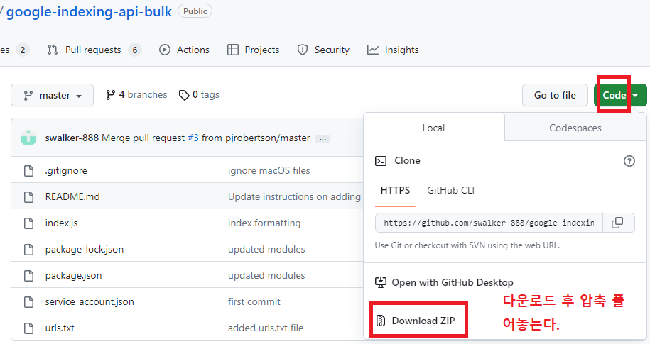 이제 Github에서 서치콘솔 색인 요청 스크립트를 다운로드 받는다. (링크)
