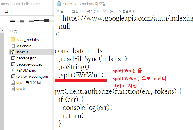 원래 코드에는 .split('\n'); 이라고만 적혀있을텐데, \n을 \r\n으로 고친다. 그 후 저장하고 닫는다.