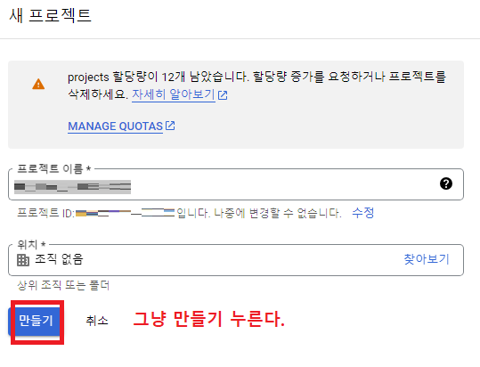 프로젝트 이름은... 그냥 기본값으로 두고 '만들기' 클릭한다.