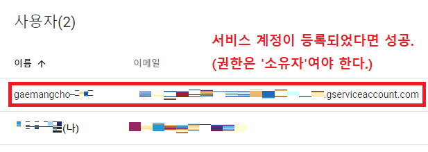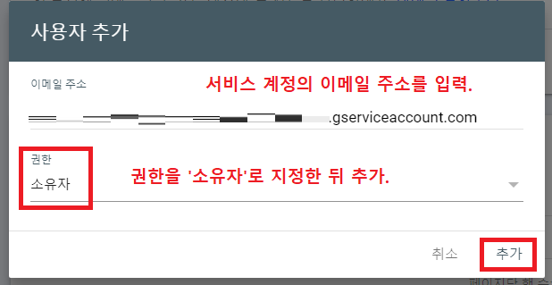 이메일 주소에는 아까 메모장에 복사해두었던 '서비스 계정의 이메일 주소' 를 입력한다. 그리고 권한은 '소유자'로 지정한 뒤, '추가' 를 누른다.