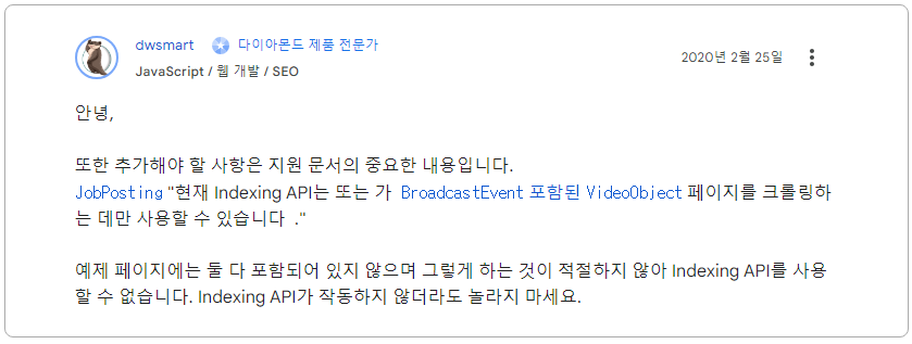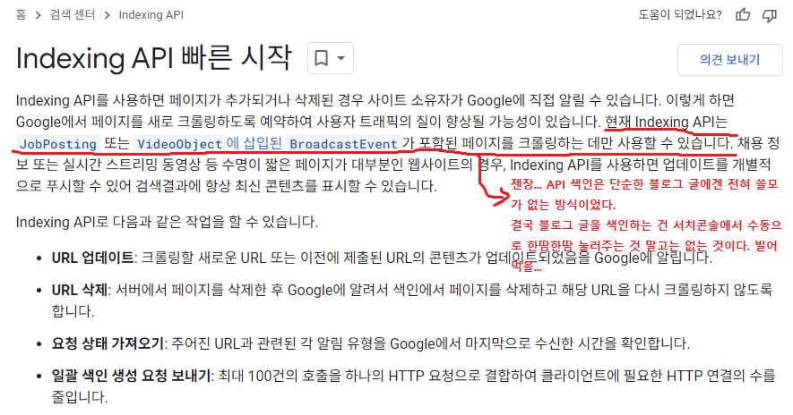 Indexing API는 구인 정보나 동영상 페이지를 크롤링하는 데만 사용할 수 있다는 것이었다.