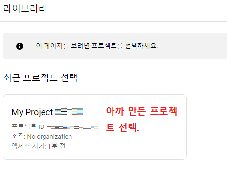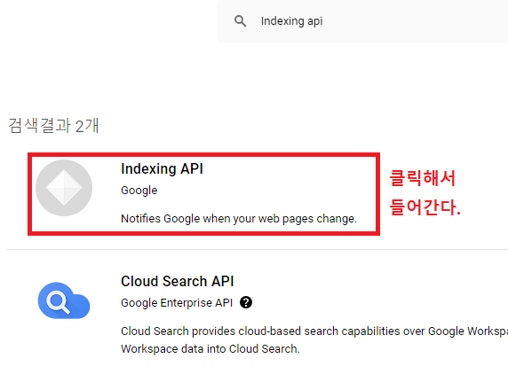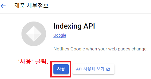검색결과에 나온 Indexing API에 들어간 뒤, 아까 생성한 프로젝트를 선택해준다.