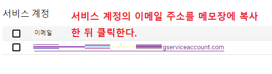 이제 서비스 계정 목록에 이메일 주소가 하나 생성되었을 텐데, 주소를 메모장에다 복사한다.