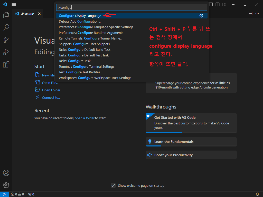 Ctrl + Shift + P 누른 뒤, 뜨는 검색창에 'configure display language' 라고 친 뒤, 해당 항목을 클릭했다.