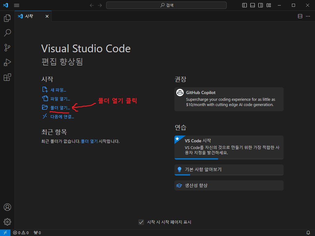 다시 열려있는 Visual Studio Code로 돌아간 뒤, '폴더 열기' 를 클릭한다.