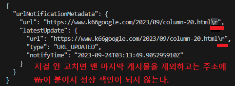 소스 코드를 고쳐야 하는 이유는, 안 고치고 색인 요청을 했을 때 URL 주소 뒤에 '\r' 이 끼어들어가는 문제가 있기 때문이다. 이러면 틀린 주소에 색인 요청을 하게 된다. 그래서 고쳐야 하는 것이다.