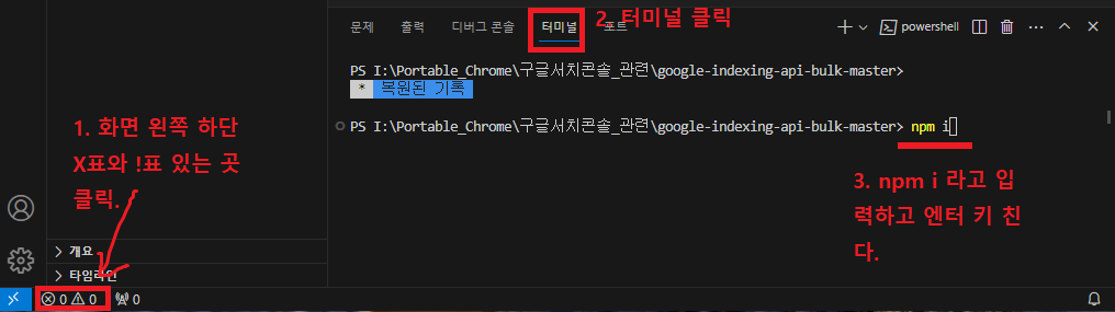 이제 화면 왼쪽 아래의 'X표와 !표' 있는 곳을 클릭하고, '터미널' 탭을 선택한 뒤 명령줄에 'npm i' 라고 입력하고 엔터 키를 친다.