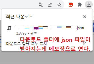 이렇게 JSON 파일이 컴퓨터의 다운로드 폴더에 저장될 것이다. 메모장을 하나 더 켜고 해당 JSON 파일을 불러온다.