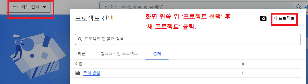 그런 다음 화면 왼쪽 위의 '프로젝트 선택' 을 누른 뒤, '새 프로젝트' 를 클릭한다.
