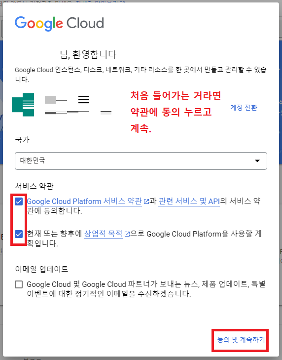 처음 클라우드에 들어온 지메일 계정이라면 이런 창이 뜨는데, 체크박스 2개에 체크하고 '동의 및 계속하기' 눌러준다.