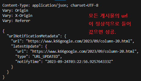 마침내 API 기능을 통하여 구글 서치콘솔에 색인 요청을 하게 된다.
