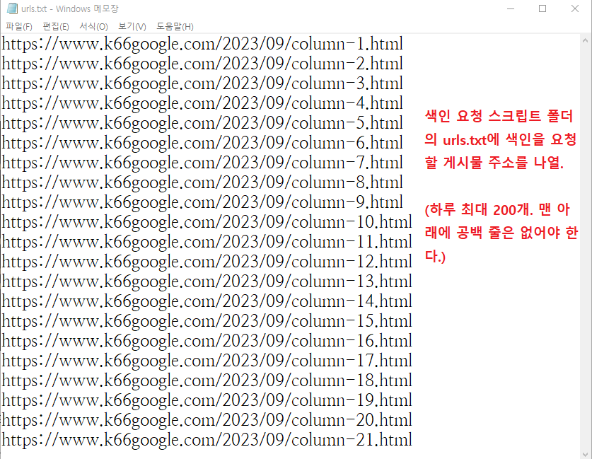 (나중에 색인 요청할 게시물 주소를 바꾸고 싶으면 urls.txt 파일을 수정하면 된다.)