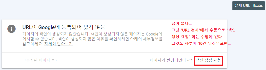 결국 검색 색인은 구글 봇이 알아서 해줄 때까지 기다리거나, 서치콘솔에서 수동으로 한땀 한땀 '색인 생성 요청' 버튼을 눌러주는 것 말고는 없는 것이다.