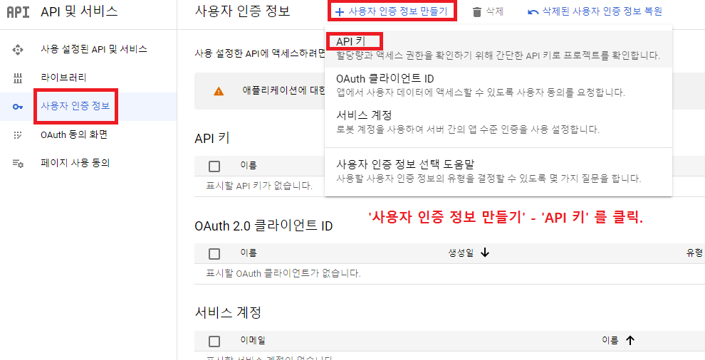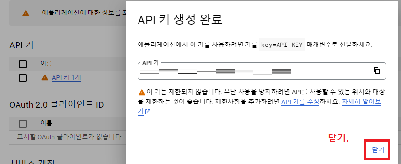해당 탭에서 '사용자 인증 정보 만들기' - 'API 키' 를 클릭한다. 생성이 완료됐다고 뜨면 '닫기' 누른다.